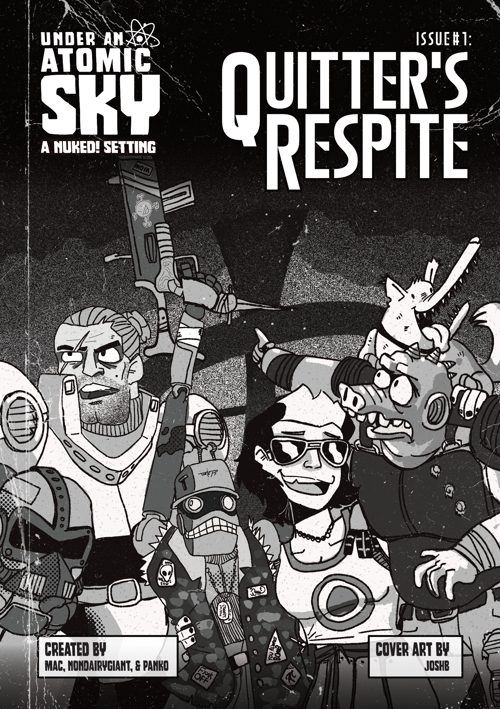 Quitter's Respite comes with 34 explorable hexes (14 unique locations, 1 settlement, and 2 mini-dungeons), a random encounter table, and a loot table. You'll also get a free copy of the NUKED! rulebook if you don't already have it.